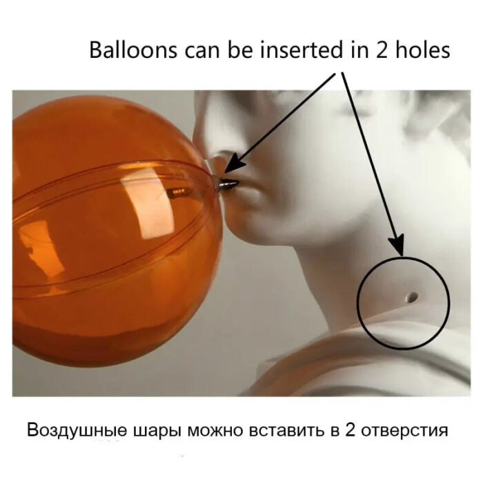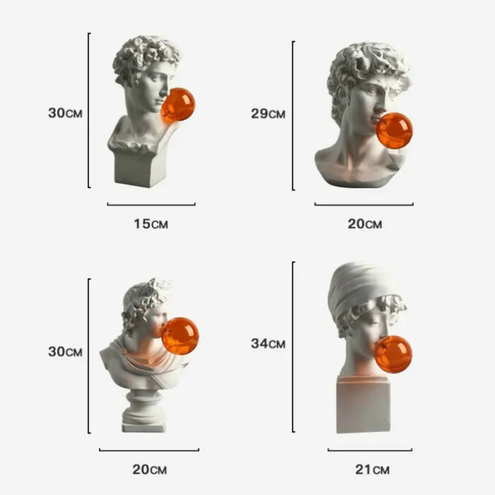 Turn your room into a stylish habitat. This minimalist decor is a modern take on the bust statue of David Apollo. Its orange balloon adds a layer of depth and luxury to the sculpture – A mix of post modern attitude with classical virtue. A modern interprtation of Michaelangelo’s sculpture of David. Give your room or office a living ensemble with a feel of roman elegance.