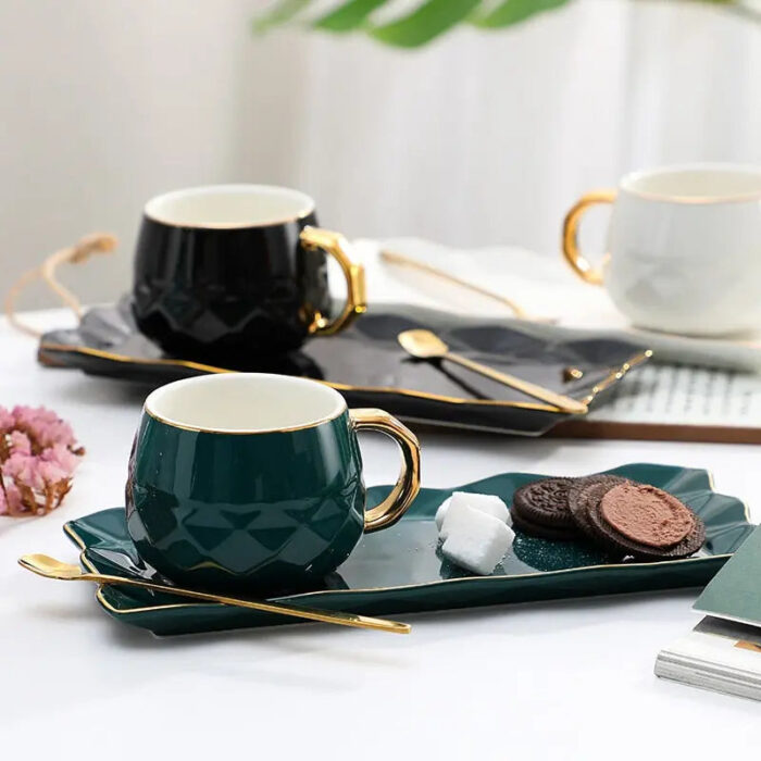 Ideal for everyday use or to WOW your guests, these elegant mug sets in solid colosrs with gold handle are stylish, elegant and durable. Made from durable ceramic and bone china, each mug has a simple yet modern shape. Each set consists of a mug, tray and a gold spoon.