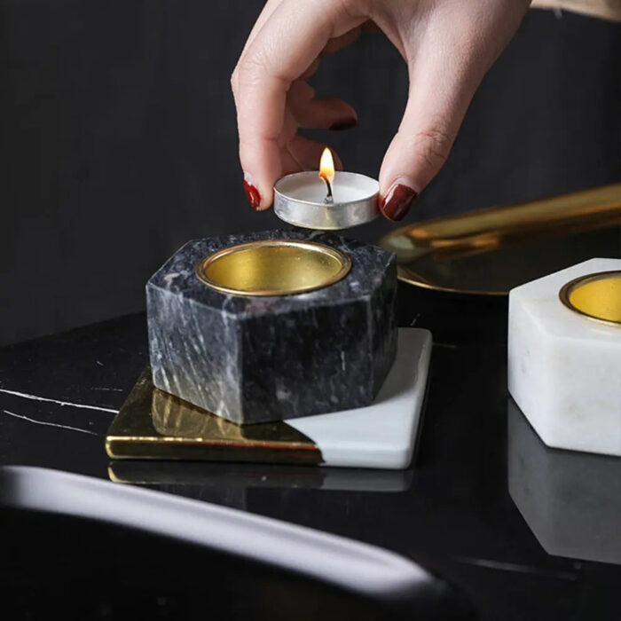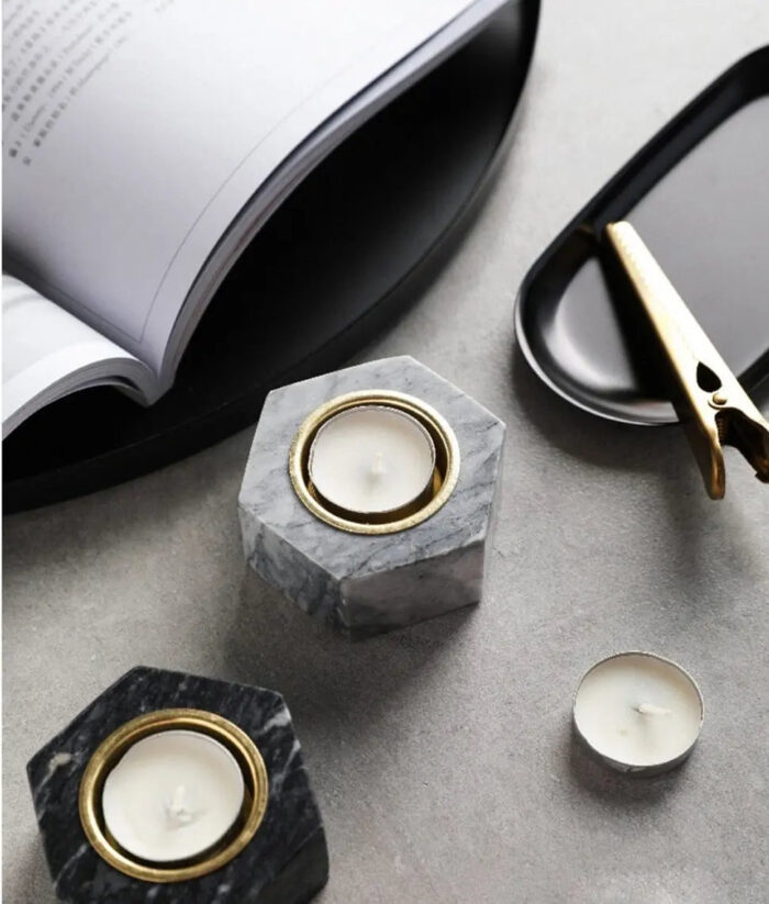 Minimalist natural marble and metal candle holders to illuminate any area of your house or office.