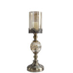 The candleholder is masterfully crafted from polished metal and frosted glass.
