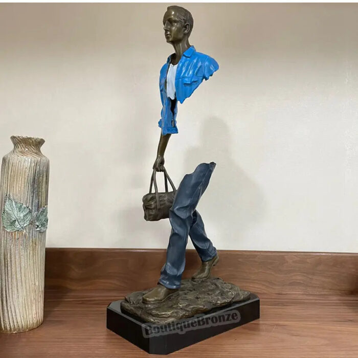 The ātravelerā by bruno catalano unites the franco-italian artistās most recent work across venice. Each bronze sculpture is characterized by the incompleteness of the central part of their bodies. with their natural and instantly understandable shape, the human forms still reference āclassicismā despite the shredding and absence of their middle body. the artist claims that they reflect the relationship between completeness and emptiness that has distinguished the large part of the 20th century.